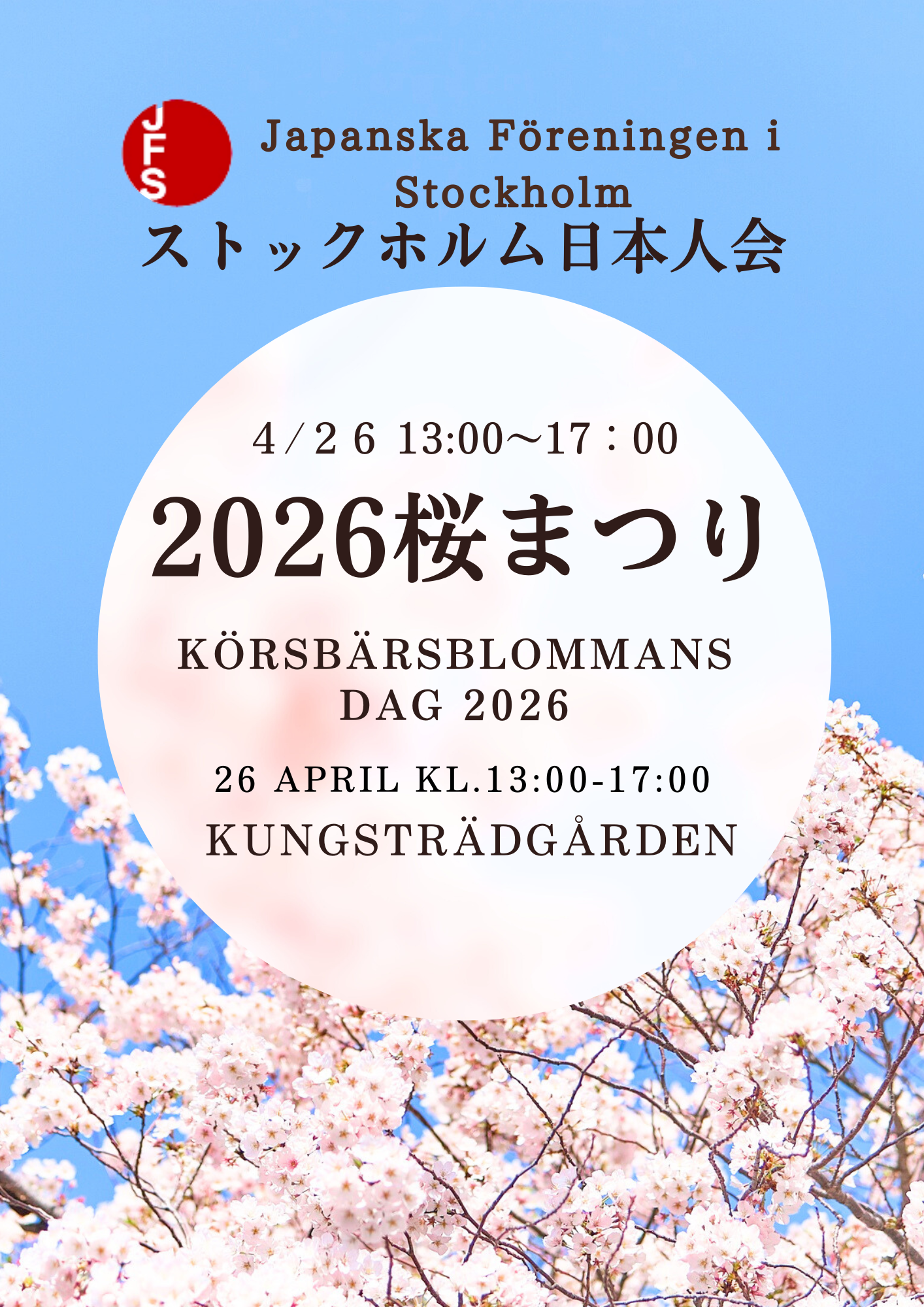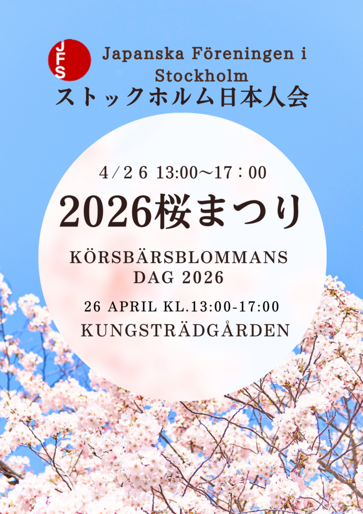 ストックホルム日本人会主催2026の桜まつり(ストックホルム市共催)が開催されます。 どうぞ皆様お誘いあわせの上、お気軽にご参加ください。