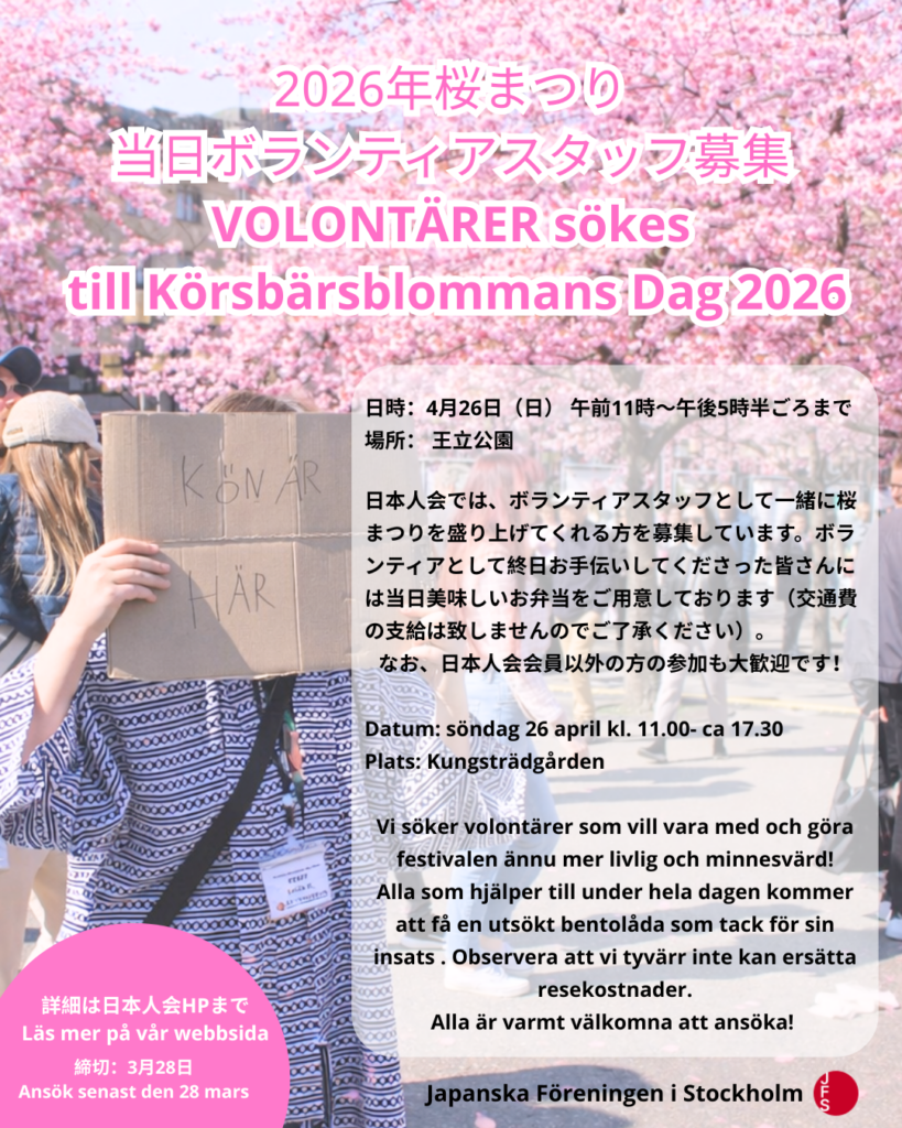 Söndag 26 april 2026 kommer Japanska Föreningen i Stockholm Körsbärsblommans Dag 2026 hållas.