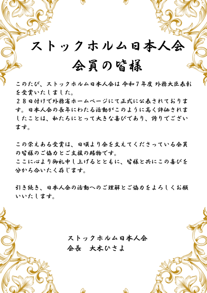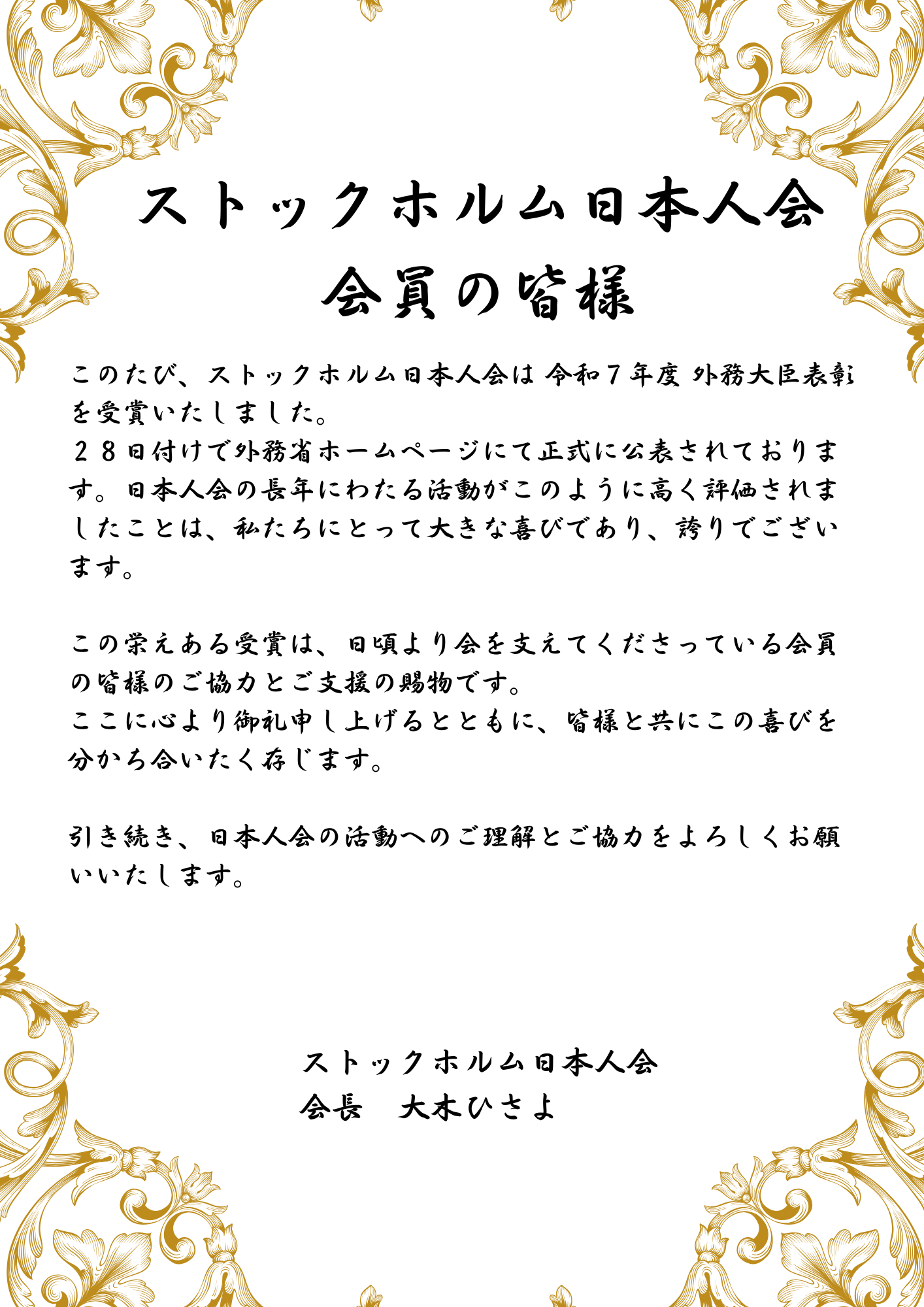Den 21 oktober hölls en ceremoni på den japanska ambassadörens residens, där Japanska Föreningen i Stockholm tilldelades den japanska utrikesministerns utmärkelse för räkenskapsåret 2025.